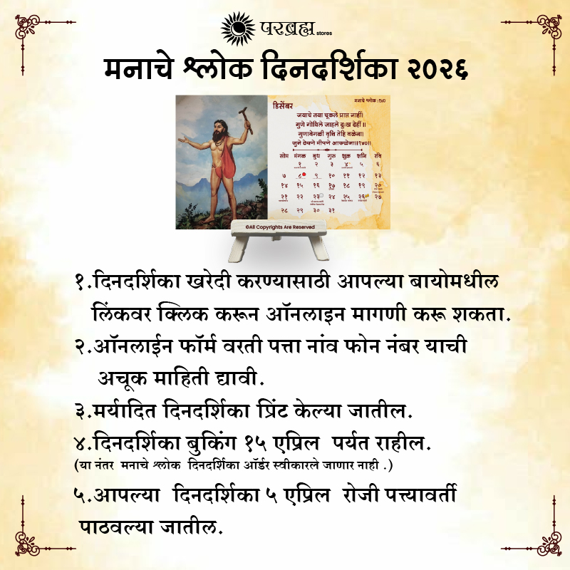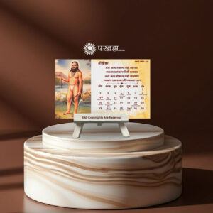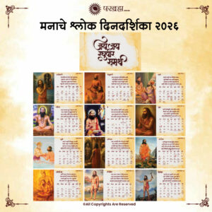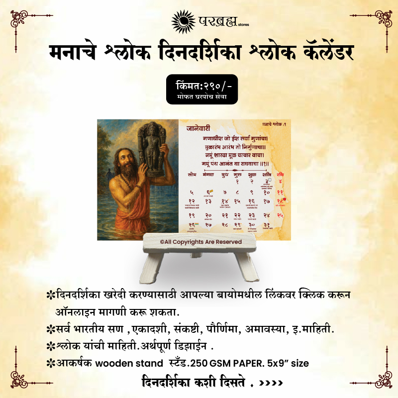 A unique 12-month desk calendar with stunning Hindu devotional artwork, Manache Shlok verses on every page, and a complete Marathi panchang. Comes with an elegant desk stand — ideal for daily spiritual inspiration.